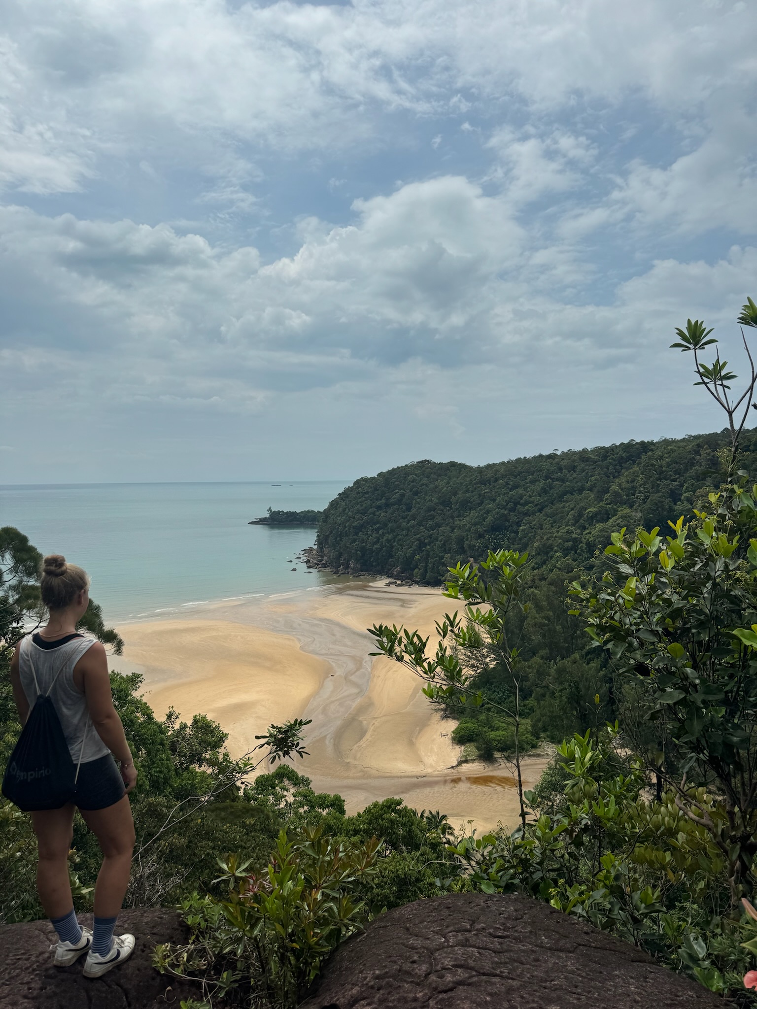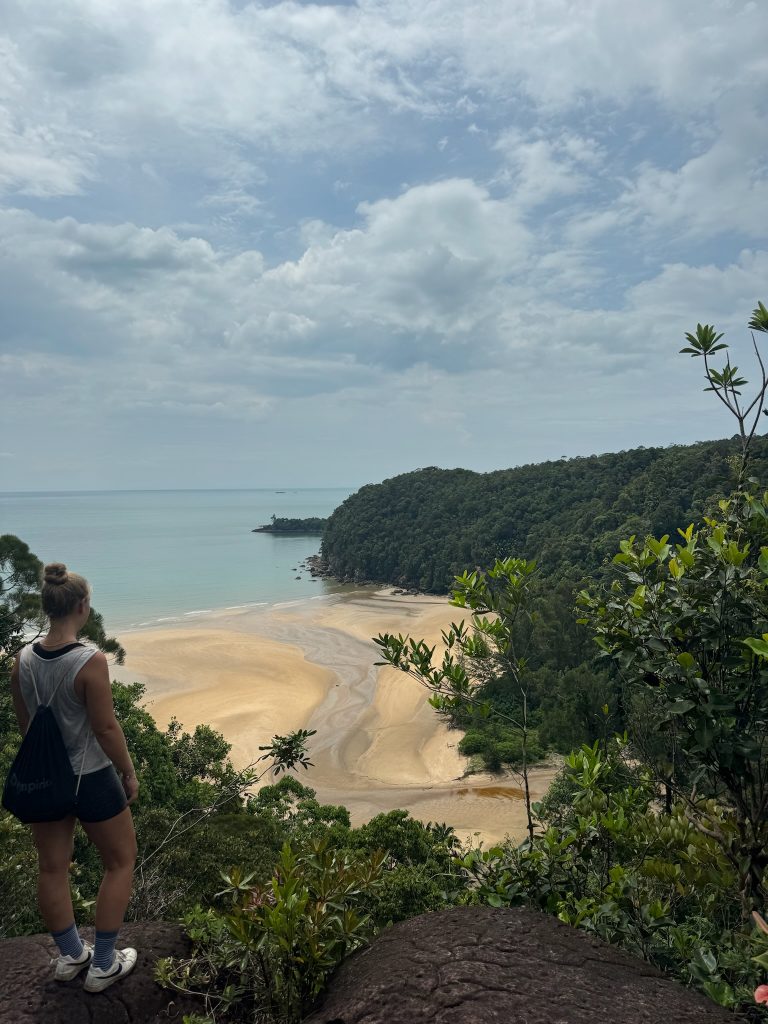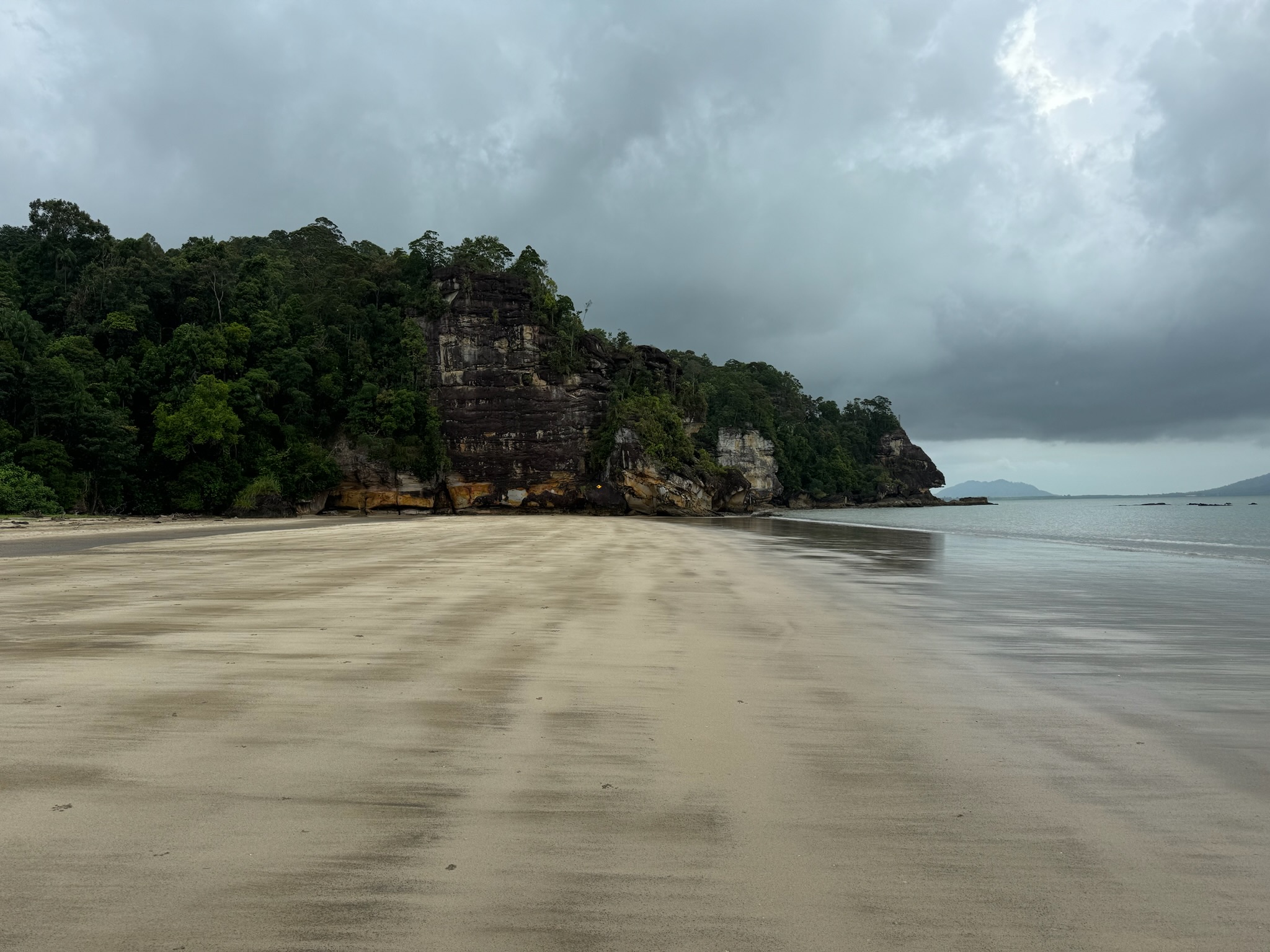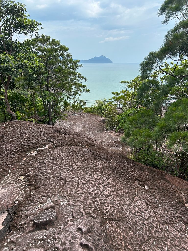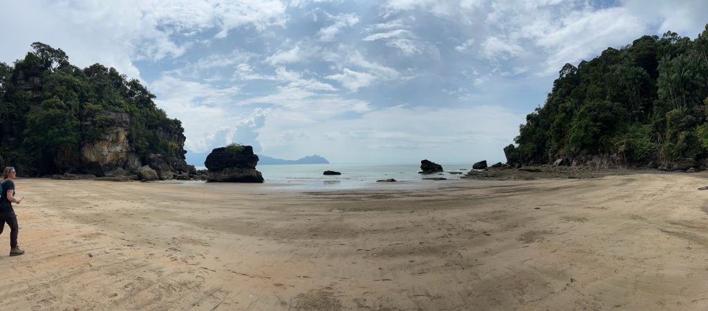 In der Bucht angekommen mussten wir unsere Schuhe ausziehen und durchs Wasser an den Strand laufen. Auch hier muss man sich registrieren und am Ende wieder austragen. An der großen Tafel suchten wir uns eine Route aus, die auch die deutsche Backpackerin machen wollte, also gingen wir zusammen. Mit dem deutschen Pärchen verabredeten wir uns auf 15 Uhr, denn da fährt das letzte Boot zurück. Wir wollten die 2,6 km lange Strecke zum Kecil Beach laufen. Die Strecke ging erst über das Gelände bis zum Wald, wo es einen steileren Pfad hoch ging. Hier begegneten wir ein paar Makaken-Affen, andere Tiere, besonders Nasenaffen, haben wir leider nicht gesehen. Der Weg ging abwechselnd durch Wald, über Felsen, über Stege und Trampelpfade. Hier ging die Vegetation in einen lichten Wald über und die Sonne kam durch die Wolken durch. Am Ende der Route kamen wir auf einem Steinplateau über einem Strand an mit Blick auf die Felsen und das Meer.