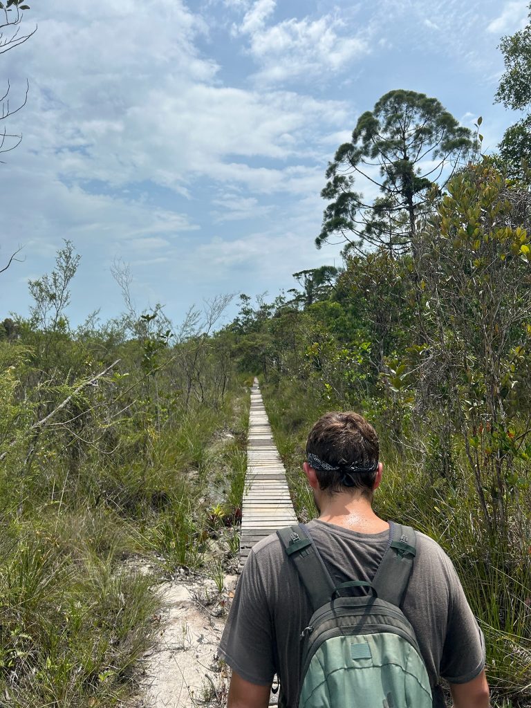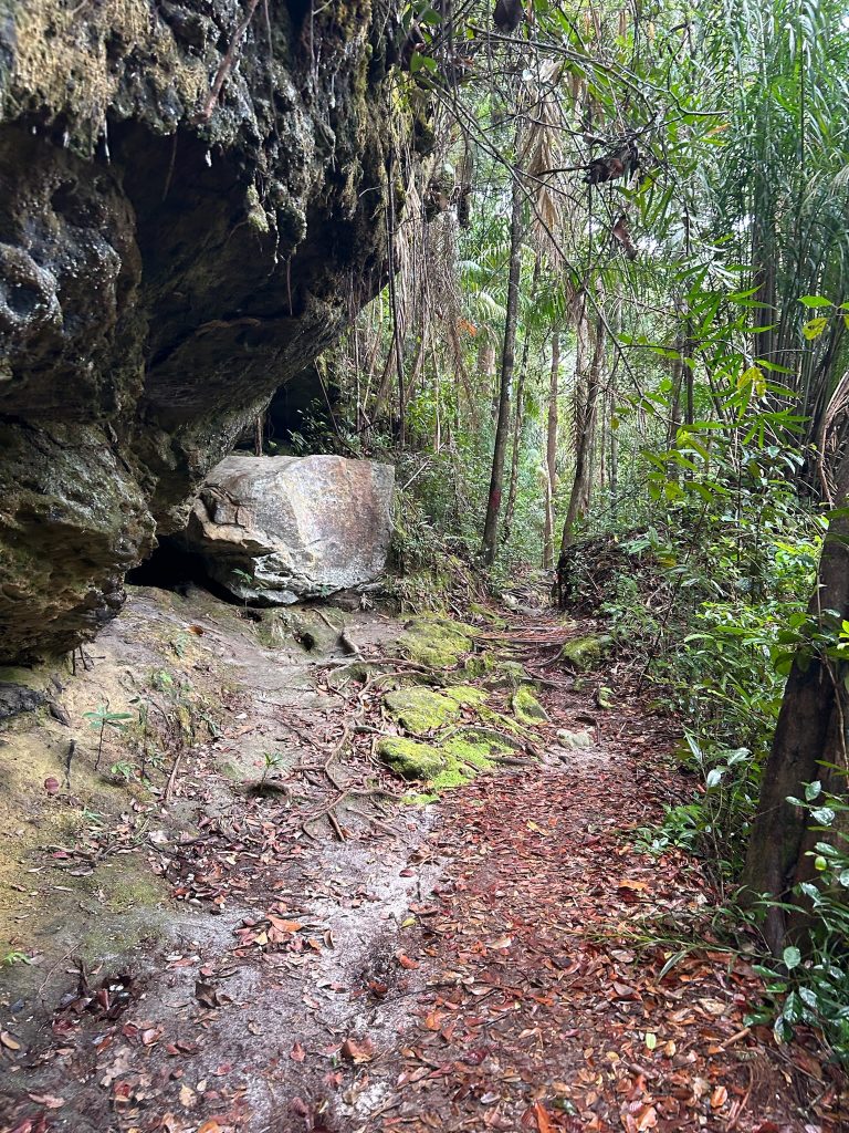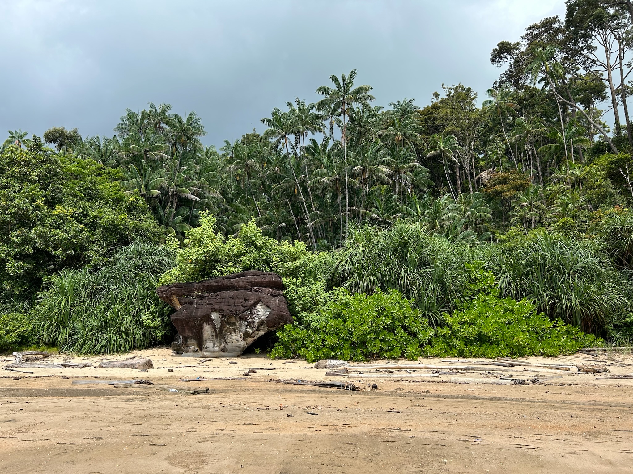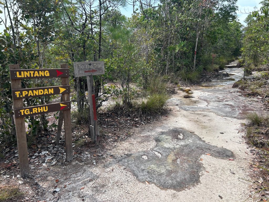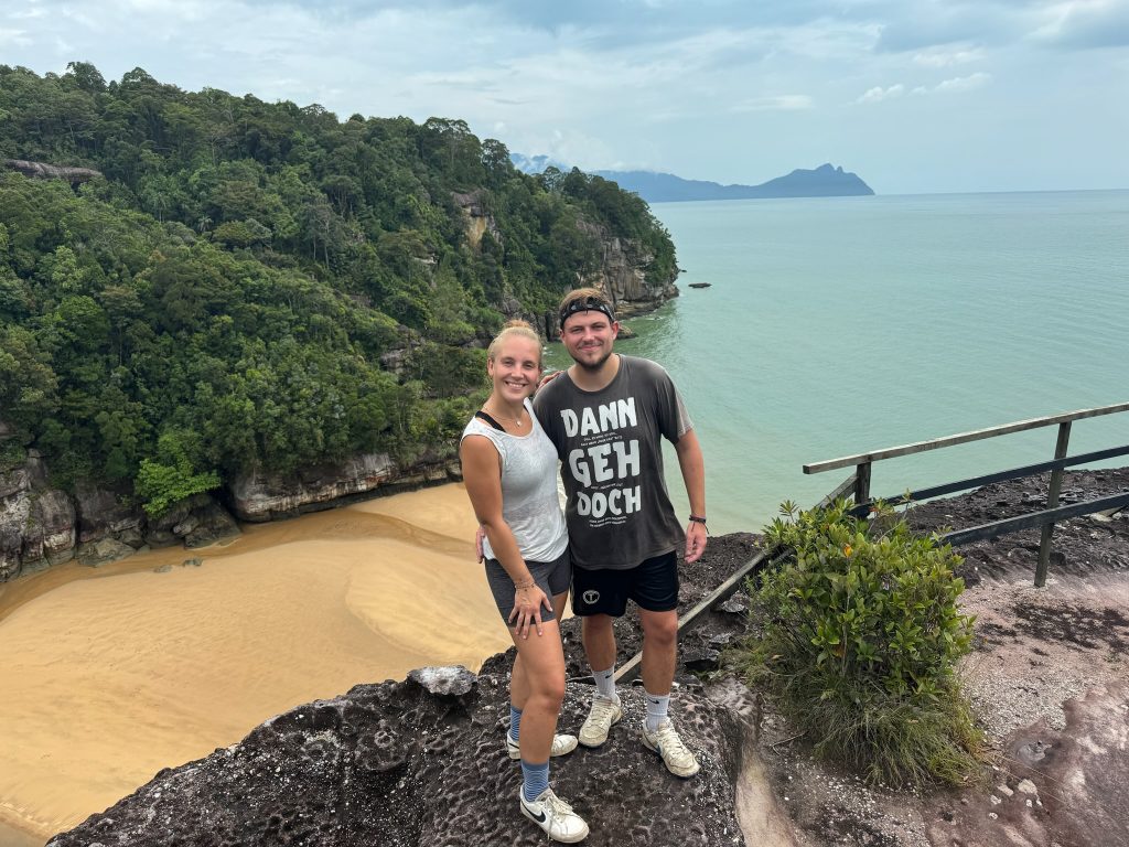 In der Bucht angekommen mussten wir unsere Schuhe ausziehen und durchs Wasser an den Strand laufen. Auch hier muss man sich registrieren und am Ende wieder austragen. An der großen Tafel suchten wir uns eine Route aus, die auch die deutsche Backpackerin machen wollte, also gingen wir zusammen. Mit dem deutschen Pärchen verabredeten wir uns auf 15 Uhr, denn da fährt das letzte Boot zurück. Wir wollten die 2,6 km lange Strecke zum Kecil Beach laufen. Die Strecke ging erst über das Gelände bis zum Wald, wo es einen steileren Pfad hoch ging. Hier begegneten wir ein paar Makaken-Affen, andere Tiere, besonders Nasenaffen, haben wir leider nicht gesehen. Der Weg ging abwechselnd durch Wald, über Felsen, über Stege und Trampelpfade. Hier ging die Vegetation in einen lichten Wald über und die Sonne kam durch die Wolken durch. Am Ende der Route kamen wir auf einem Steinplateau über einem Strand an mit Blick auf die Felsen und das Meer.