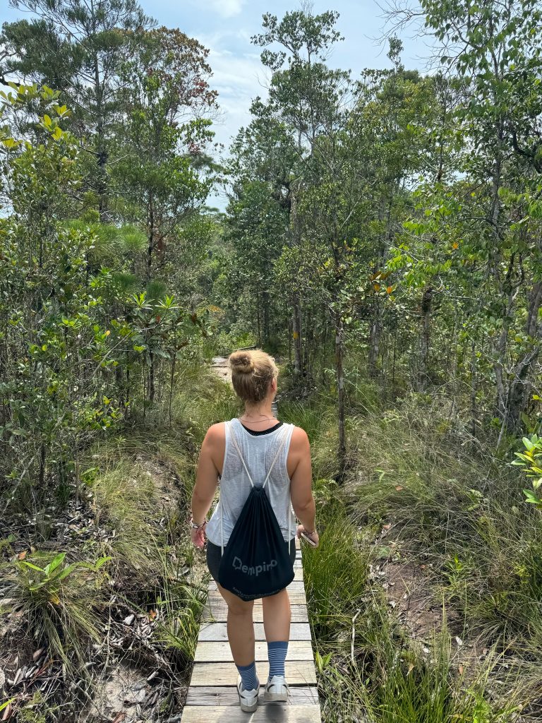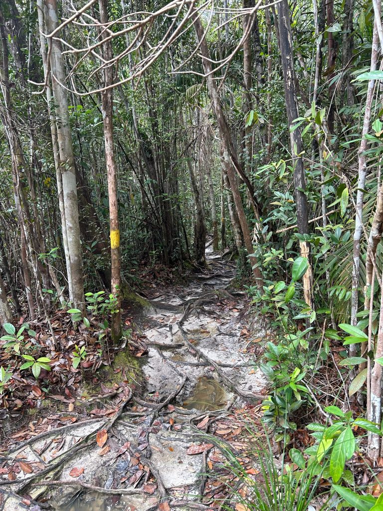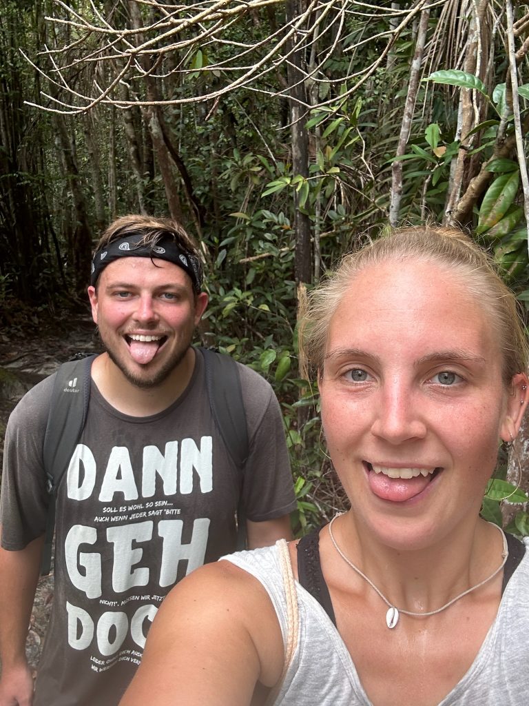 Wir gingen ein Stück zurück bis zur Kreuzung und bogen noch auf eine andere Route ab, an dessen Ende wir ebenfalls an einem Aussichtspunkt über dem Besar Beach ankamen. Danach machten wir uns wieder auf den Rückweg und wir merkten, dass die Hitze uns ganz schön zu schaffen machte bei der Anstrengung. Kurz vor dem Ende bogen wir noch auf einen 800 m langen Pfad, der am Berg entlang hoch und runter bis zur Paku Bucht führte. Hier machten wir eine kurze Pause bis wir weiter mussten, damit wir rechtzeitig zurück kamen. Auf halber Strecke zurück zum Ausgangspunkt trafen wir auf das Pärchen. Auf einmal fing es an zu regnen und wurde ganz schön heftig. Wir waren zwar schon nassgeschwitzt aber zogen unsere Regenponchos an und kamen komplett durchnässt am Registrierungsgebäude an. Unser Bootsführer sprach uns an, dass wir noch warten bis wir losfahren können.