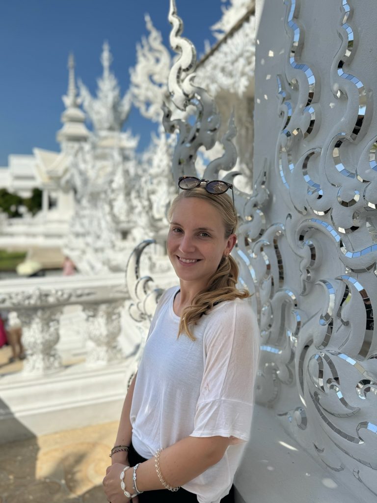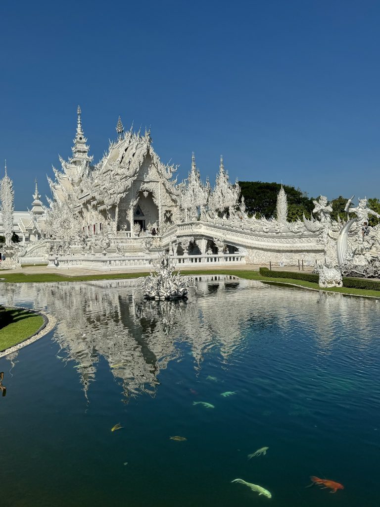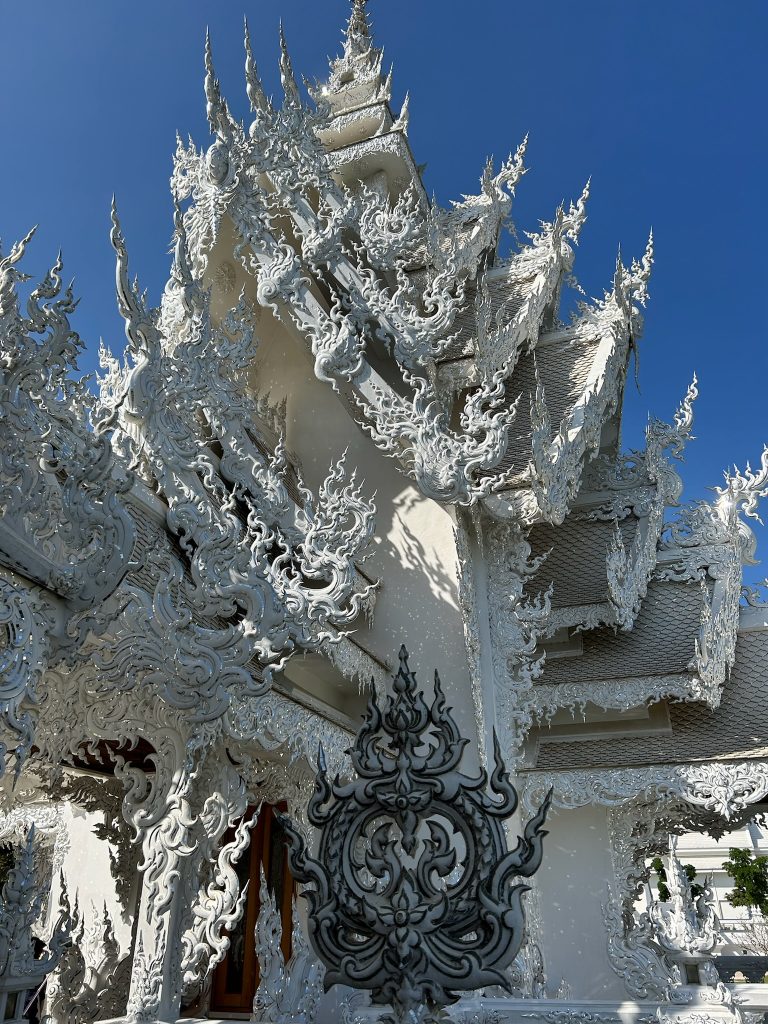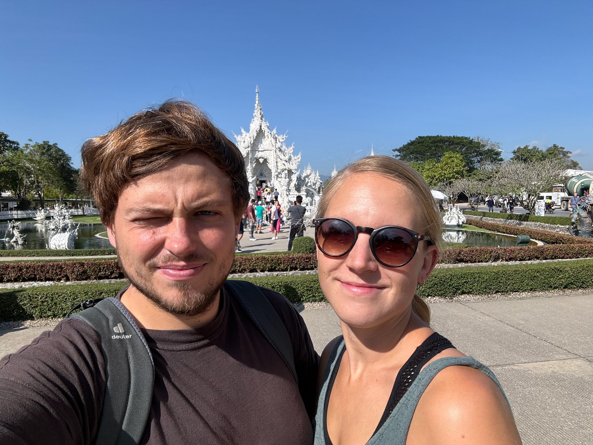 Heute ging es Marco besser. Wir machten uns wieder Frühstück in der Küche und mieteten uns im Verleih nebenan einen Roller für heute. Wir fuhren etwa eine halbe Stunde in den Süden von Chiang Rai zum „White Temple“. Wir wollten eigentlich früh hier sein, aber das haben wir leider nicht geschafft…Um 10 Uhr waren schon viele Menschen bei der beliebten Sehenswürdigkeit. Es ist ein modern entworfener Tempel komplett in weiß und mit Mosaiken aus Spiegelsteinchen, die wunderschön in der Sonne glitzern. Danach gönnten wir uns noch einen Mittagssnack in einem Foodcourt direkt gegenüber.