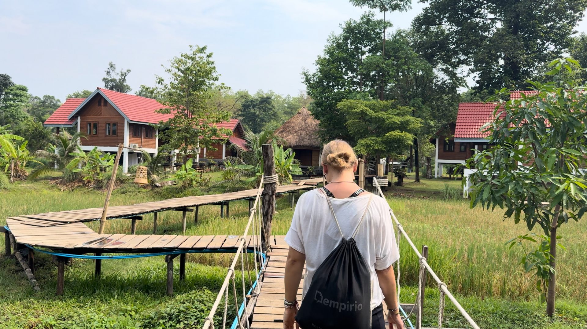 Tja jetzt hat’s mich mal wieder erwischt – ich bin mit Bauchbeschwerden aufgewacht. Um 9:30 Uhr gingen wir zum Frühstück aber ich konnte leider kaum etwas von dem guten Frühstücksbuffet essen. Danach hab ich mich nochmal hingelegt bis wir um 12 Uhr auschecken mussten. Zum hinten-auf-dem-Roller-sitzen war ich gerade fit genug. Wir fuhren den Loop weiter, ca. 2,5 Stunden bis zur nächsten Unterkunft in Tad Lo Village. Unterwegs hat es angefangen zu nieseln und es wurde tatsächlich etwas frisch, sodass wir unsere Regencapes rausholten. Neben Kühen am Straßenrand muss man hier auch auf Ziegen aufpassen. Hier konnten wir mehr von der Landschaft sehen und kamen durch paar kleine Ortschaften durch. Endlich, nachdem unsere Hintern wieder weh taten, sind wir in der Unterkunft angekommen und checkten in unseren Holzbungalow mit Blick auf einen Fluss ein. Ich hab mich gleich wieder hingelegt. Abends haben wir in unserer Unterkunft Essen bestellt, worauf wir über eine Stunde warten mussten, aber ich konnte noch nichts essen.