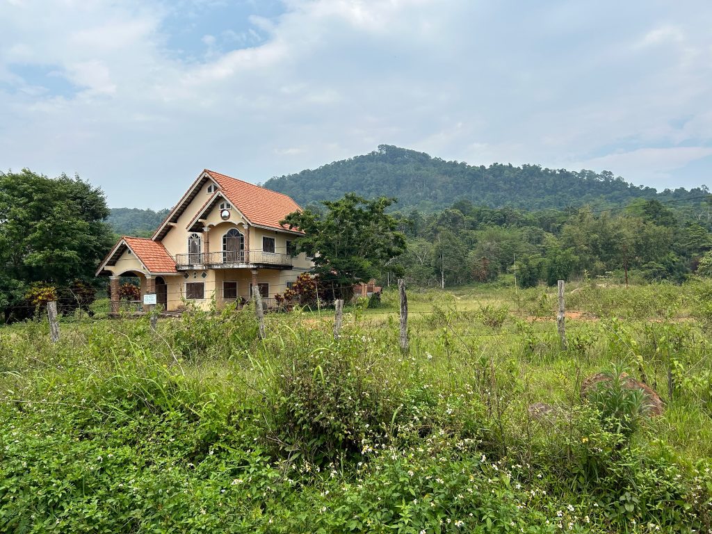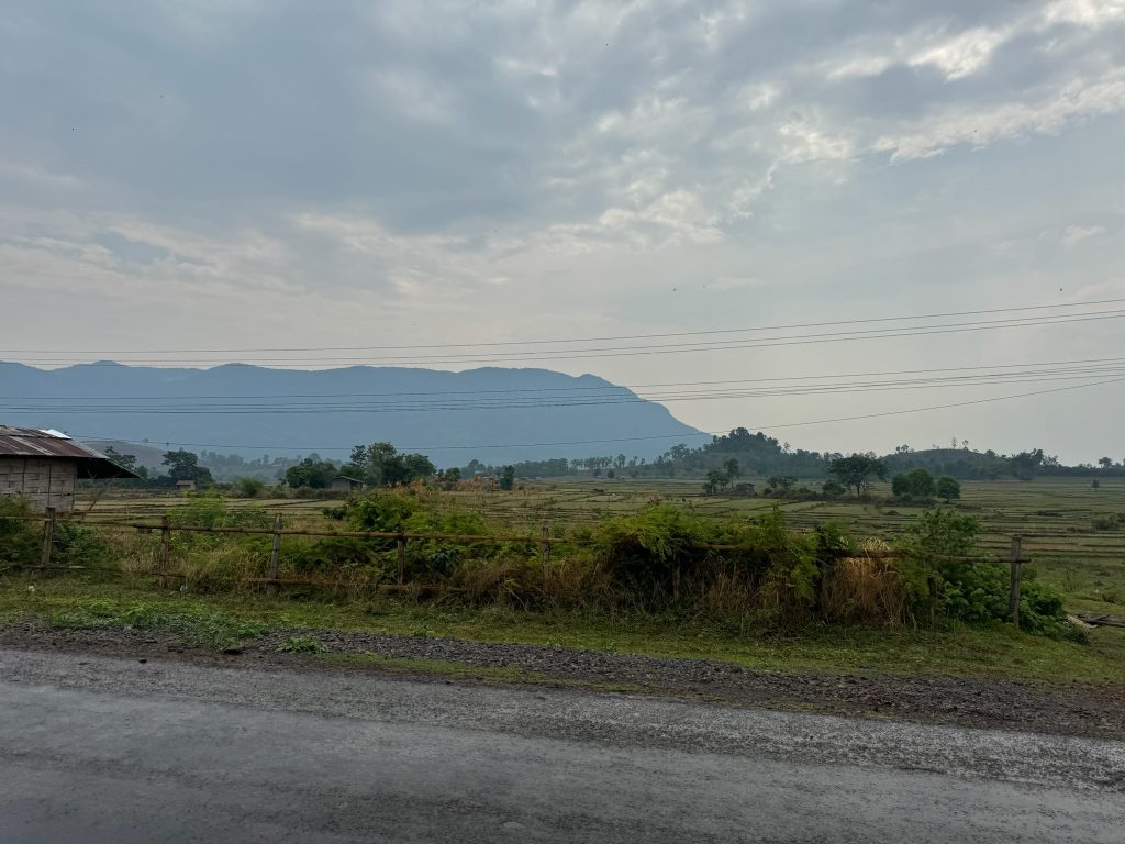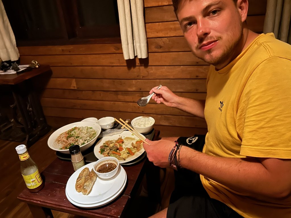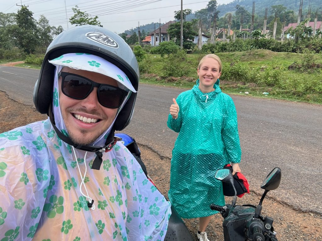 Tja jetzt hat’s mich mal wieder erwischt – ich bin mit Bauchbeschwerden aufgewacht. Um 9:30 Uhr gingen wir zum Frühstück aber ich konnte leider kaum etwas von dem guten Frühstücksbuffet essen. Danach hab ich mich nochmal hingelegt bis wir um 12 Uhr auschecken mussten. Zum hinten-auf-dem-Roller-sitzen war ich gerade fit genug. Wir fuhren den Loop weiter, ca. 2,5 Stunden bis zur nächsten Unterkunft in Tad Lo Village. Unterwegs hat es angefangen zu nieseln und es wurde tatsächlich etwas frisch, sodass wir unsere Regencapes rausholten. Neben Kühen am Straßenrand muss man hier auch auf Ziegen aufpassen. Hier konnten wir mehr von der Landschaft sehen und kamen durch paar kleine Ortschaften durch. Endlich, nachdem unsere Hintern wieder weh taten, sind wir in der Unterkunft angekommen und checkten in unseren Holzbungalow mit Blick auf einen Fluss ein. Ich hab mich gleich wieder hingelegt. Abends haben wir in unserer Unterkunft Essen bestellt, worauf wir über eine Stunde warten mussten, aber ich konnte noch nichts essen.