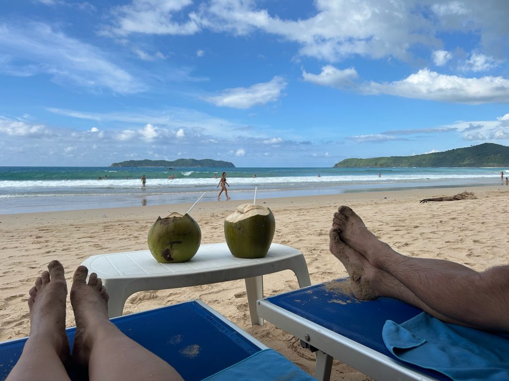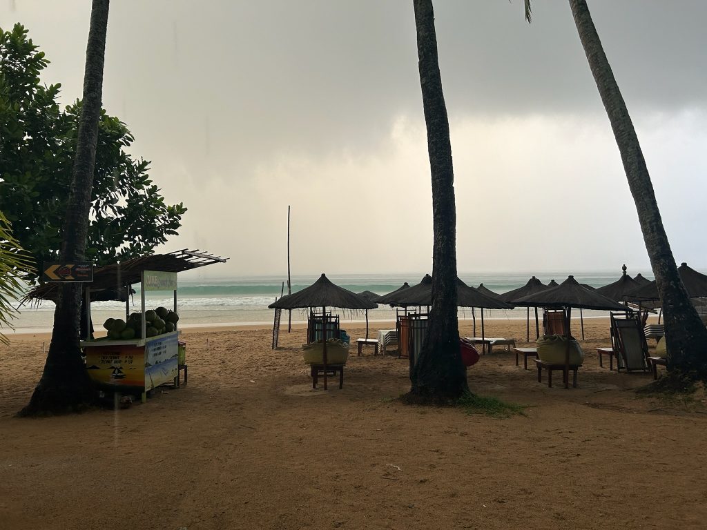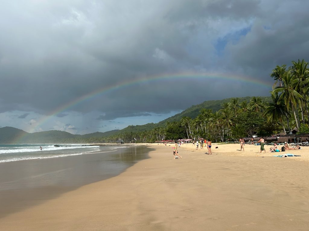 Heute fuhren wir zum Nacpan Beach, einer der beliebtesten Strände hier. Wir suchten uns in einem der Strandlokale eine Liege aus (8€). Eine Kokosnuss war im Preis inklusive, aber sie hat uns leider überhaupt nicht geschmeckt und wir sind eh nicht so die Fans. Wir wollten ins Wasser, aber die Wellen hier sind so heftig, dass man kaum baden kann und danach die Badesachen voller Sand sind. Wir hatten leider nicht viel Entspannungszeit, denn nach ca. zwei Stunden hat es angefangen zu regnen. Erst nur leicht und es gab einen schönen Regenbogen über dem Strand, später wurde es so heftig, dass wir uns in ein Strandlokal setzen mussten. Während wir warteten bis es aufhörte, bestellten wir uns hier etwas zum Abendessen. Es wollte aber nicht aufhören und um 17:30 Uhr entschieden wir uns, einfach loszufahren, damit es nicht zu spät wird. Also liefen wir zum Roller, zogen unsere Regenponchos an und fuhren im Dunkeln und strömenden Regen los. Unterwegs hörte es auf zu Regnen aber man sah noch das Gewitter und die Blitze am Himmel. Nach einer Dusche im Hotel gingen wir nochmal in die Stadt.